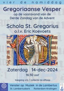 Vier het begin van de Advent in de namiddag van zaterdag 14 december met een Gregoriaanse vesper. Gedurende ruim een half uur waan je jezelf even in de verstilde rust van een klooster door de gezangen van de Schola St. Gregorius. Dit is de mooi klinkende groep mannen, die wekelijks tijdens de hoogmis in de St. Lambertuskerk deze middeleeuwse muziek ten gehore brengt samen met en onder leiding van Eric Koevoets. Tijdens de Gregoriaanse Vesper doen zij dit vanaf het priesterkoor. Het begint om 16:30 uur, de toegang is gratis met een collecte na afloop.