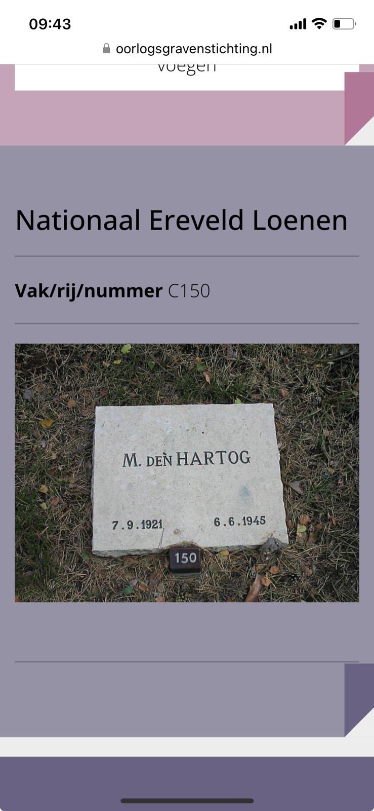 Recent heb ik ontdekt dat haar oom Martinus den Hartog, op de erebegraafplaats in Loenen ligt. (Hij heeft in de oorlog in een concentratiekamp gezeten en is daar overleden) Zij is mogelijk de enige nabestaande die hopelijk meer kan vertellen hierover. Alle info is welkom, ook als iemand iets meer weet over Martinus den Hartog