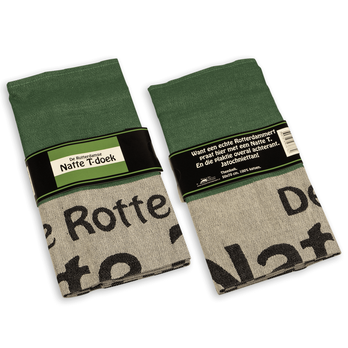 Ludieke theedoek in de kleuren van de Rotterdamse vlag met de tekst: De Rotterdamse Natte T-doek. De kwalitatief hoogwaardig gewoven theedoek is van 100% katoen, meet 50×70 cm en is voorzien van een ophanglus.